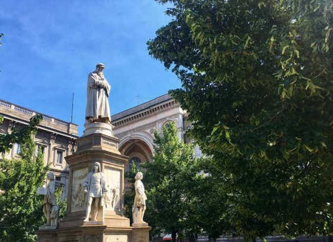 Impossible d’évoquer les statues milanaises sans celle à l’effigie du maître florentin Léonard de Vinci, en cette année d’hommage pour le 500ème anniversaire de sa mort (https://lepetitjournal.com/milan/a-voir-a-faire/500-ans-de-la-mort-de-leonard-de-vinci-les-grands-evenements-milan-255376).