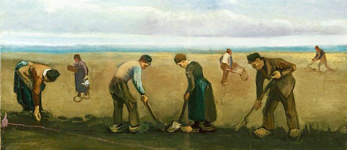 Des trois, c'est Van Gogh qui dépeint au mieux le thème d'Expo 2015, Nourrir la planète. Energie pour la vie. Il observe le cycle de vie, de la terre à la table, à travers des études de paysans au travail aboutissant à son premier chef d'?uvre : Les mangeurs de pommes de terre (1885). Autour d'une table faiblement illuminée à la chandelle, les paysans mangent leurs patates avec le teint gris de la terre qu'ils travaillent. "Ce tableau parle du fait que les personnes ont gagné honnêtement leur propre nourriture", écrit à ce propos l'artiste à son frère Theo. Il ne peint pas des mains mais des gestes, ni des têtes mais des expressions.
