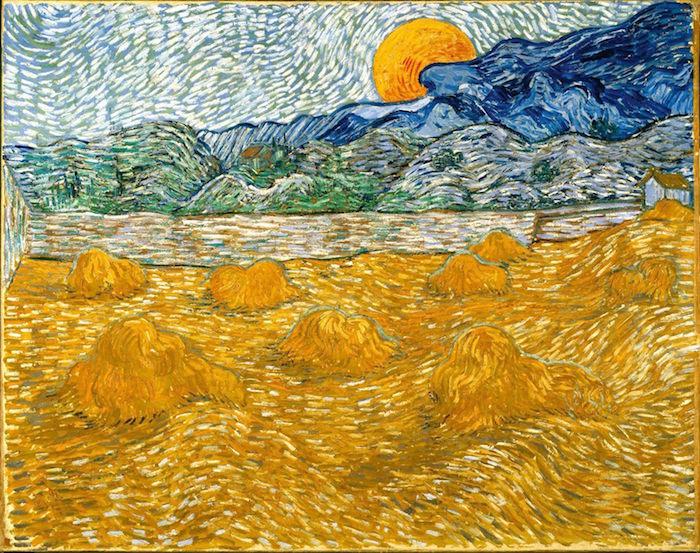 La dernière section: Couleur et vie est un plaisir pour les yeux. Sept huiles, la plupart en provenance du Kröller-Müller Museum d'Otterlo, décrivent le travail dans les champs, les oliveraies ou les vignobles: "Je suis en ce moment occupé avec un ciel bleu sur une immense vigne verte, violette, jaune avec des treillis noirs et oranges". La présence des travailleurs ici diminue en échelle alors qu'elle s'estompe complètement dans le magnifique champs de blé Paysage au lever de lune (1889) depuis la clinique de Saint-Rémy où il se soigne d'attaques de panique. Leur histoire (des champs de blé) est la nôtre parce que nous nous nourrissons de pain, nous sommes fait en grande partie de blé...et nous aussi devons croître au point d'être fauchés, parvenus à maturité...je m'habitue à l'idée". Il se suicide en 1890 à Auvers-sur-Oise, à l'âge de 37 ans.