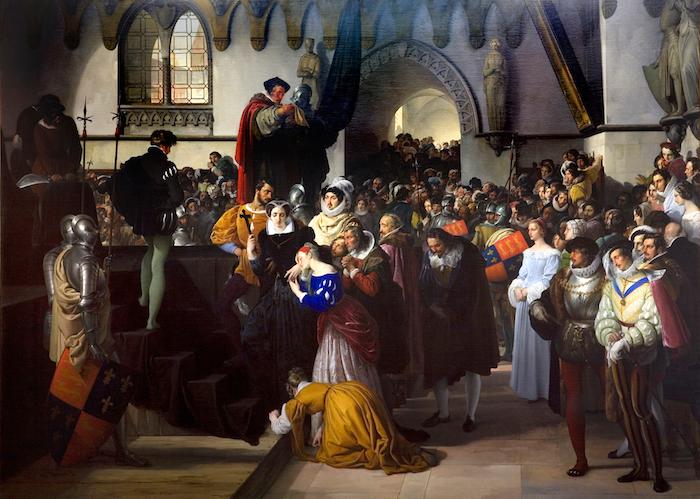 En plus d'avoir un père d'origine française, Hayez entretient avec la France un attachement à deux volets : artistique et historique. Le premier se vérifie dans ses influences picturales. Hayez s'est par exemple inspiré de Géricault et de son Radeau de la Méduse pour sa toile Barca di Greci fuggitivi. Mais c'est avec son ?uvre Maria Stuarda nel momento che sale al patibolo, en 1827, que son inspiration française, son admiration pour Delacroix, devient la plus évidente. Comme Delacroix, il a cette fascination pour les scènes historiques. L'?uvre comporte 200 personnages, dont les visages correspondent tous à des portraits de milanais réels vivant à son époque. A sa parution, le tableau a beaucoup surpris, notamment car les personnes s'y reconnaissaient. Cette toile montre aussi l'extraordinaire travail du peintre sur les costumes. La couleur du velours, le reflet argenté et la froideur du métal des armures.