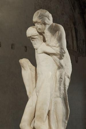 L'oeuvre a été découverte en 1564 à Rome, année du décès de Michel-Ange Buonarroti (né à Caprese en 1475). La Pietà Rondanini, représente la Madonne soulevant le corps mort de son fils, Jésus, après la crucifixion. C'est une sculpture différente des autres travaux de l'artiste. Loin de ses canons de beauté habituels et de la Pietà de la basilique Saint Pierre, où l'on voit le corps vigoureux du Christ aux genoux d'une Marie adolescente.