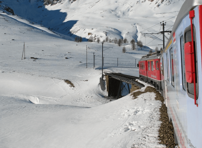 Un train définitivement unique au monde. La ligne ferroviaire relie Tirano, ville italienne à la frontière suisse à Saint Moritz en Suisse, et traverse les Alpes, à 2.256 mètres d'altitude ! Au delà de son attractivité touristique, la ligne permet le transport de marchandises.
