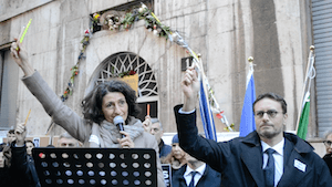 Annie Rea, présidente de Milan Accueil et Olivier Brochet, Consul général de France à Milan brandissent leur crayon pour la Liberté