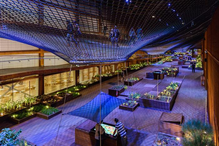 Le pavillon s'étend sur 4.000 mètres carrés, et se divise en trois étages, trois espaces principaux : le filet, la salle d'exposition et le jardin tropical. La structure en bois est très aérée, ouverte sur l'extérieur et ressemble à une cabane. L'attrait majeur qui ravie les visiteurs est le filet. Entre la toile d'araignée, des parcs pour enfants et le hamac géant. Le public est invité à grimper dessus, dès l'entrée, pour arriver au troisième étage. Difficile de réussir l'exercice grâcieusement, mais c'est amusant. N'ayez-pas peur, le filet est solide ! Il peut supporter le poids de 600 personnes. Il a été pensé comme un symbole du réseau agricole brésilien, décentralisé, flexible, lié et solidaire. Comme pour dire, la seule façon de franchir les obstacles et d'atteindre la croissance, c'est ensemble.