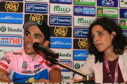 Pour ma part, j'ai traduit Alberto Contador aux conférences de presse du Giro 2008 et ai été frappée par sa détermination, sa concentration et son sérieux. Je peux dire qu'il a remporté ce Giro d'Italia grâce à une grande force physique et mentale, au professionnalisme qui le caractérise et à l'expérience accumulée dans les grands Tours. Déterminé il l'est encore cette année : hier, le Giro quasi terminé, il annonçait sa tête déjà au Tour de France.