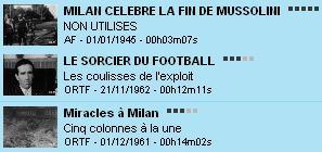 Depuis quelques semaines, l'INA rend accessible 60 ans d'archives sur son site Internet (pour en savoir plus : WEB - Les archi archives de l'INA, LPJ, 26/05/06). Certaines archives vidéo concernent Milan et font revivre ou découvrir de grands moments comme la libération de la ville, la mort de Mussolini, puis la reconstruction et le miracle économique. Le calcio est aussi àl'honneur avec un reportage remarquable sur HH, le sorcier du football.