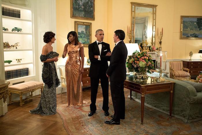 Le futur ancien président des États-Unis a choisi le « meilleur pour la fin » selon ses dires, pour son dernier dîner d'État à la Maison Blanche : Matteo Renzi était l'invité, le mardi 18 octobre, du couple Obama. Sur le parvis de la Maison Blanche, les deux couples ont fait forte impression en habit de lumières. Les deux hommes ont arboré un smoking sobre tandis que les deux épouses, Michelle Obama et Agnese Landini se sont présentées avaient des robes issues de la haute couture italienne. La Première Dame des États-Unis a sût flatter le savoir faire italien avec une longue robe Versace en or rose.