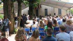 La cérémonie a commencé aux alentours de onze heures devant la villa de l'école. Des représentants de la mairie de Varese, du centre de recherche de la Commission européenne, les directeurs de l'école et le recteur de l'université de l'Insubria à Varese sont venus pour exprimer leurs félicitations aux élèves fraîchement bacheliers.