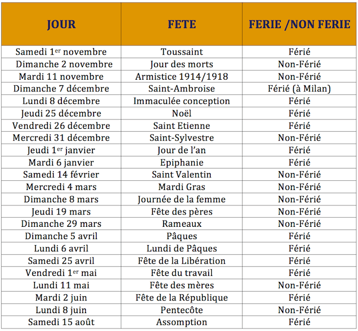 Les vacances de Noël sont toujours similaires entre la France et l'Italie. Les vacances d'Hiver des écoles françaises en Italie tombent par contre, cette année, en même temps que la zone B (Académie d'Aix-Marseille, Lille, Tours, Strasbourg).
