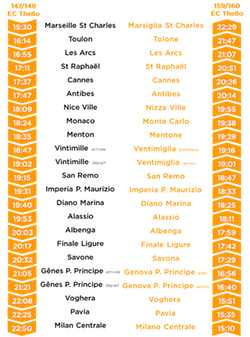 Le temps de trajet est cependant assez long. Le voyage dure 7h20, soit un peu plus qu'un aller simple en TGV Paris-Milan. Le train s'arrête dans 9 gares françaises et 12 italiennes avant d'arriver à destination. Parmi elles : Toulon, Cannes, Nice, Monaco, Savona et Genova sont desservies.