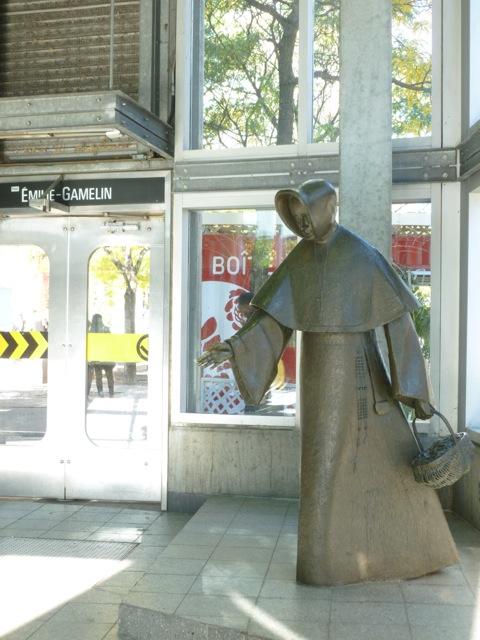Le circuit commence et s'achève au croisement des lignes verte, jaune et orange : la station de métro Berri-UQAM. En sortant du côté de Sainte Catherine, une statue de bronze est logée là, parmi la foule des passants. C'est celle de la religieuse Emilie Gamelin par l'artiste Raoul Hunter, à l'endroit où elle ouvrit jadis plusieurs refuges pour miséreux.
