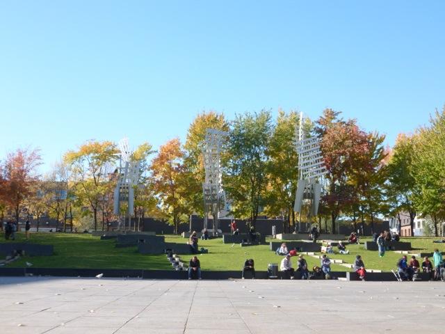 En une heure, on aura croisé la route de fontaines d'eau en cascade rappelant étrangement des gratte-ciels sur la place Emilie Gamelin, d'étincelles d'aluminium à la Grande Bibliothèque, de feuilles d'arbres blanches géantes et entrelacées au parc Toussaint Louverture, et des panneaux de verre et de métal aux inspirations photovoltaïques à L'UQAM.
