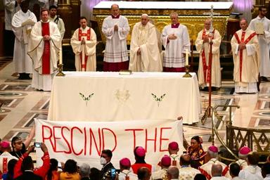 Dans la matinée, peu avant le début de la messe de réconciliation, à Sainte-Anne de Beaupré, deux autochtones ont déployé une banderole sur laquelle on pouvait lire: "Révoquez la doctrine", devant l'autel et à quelques mètres de François.