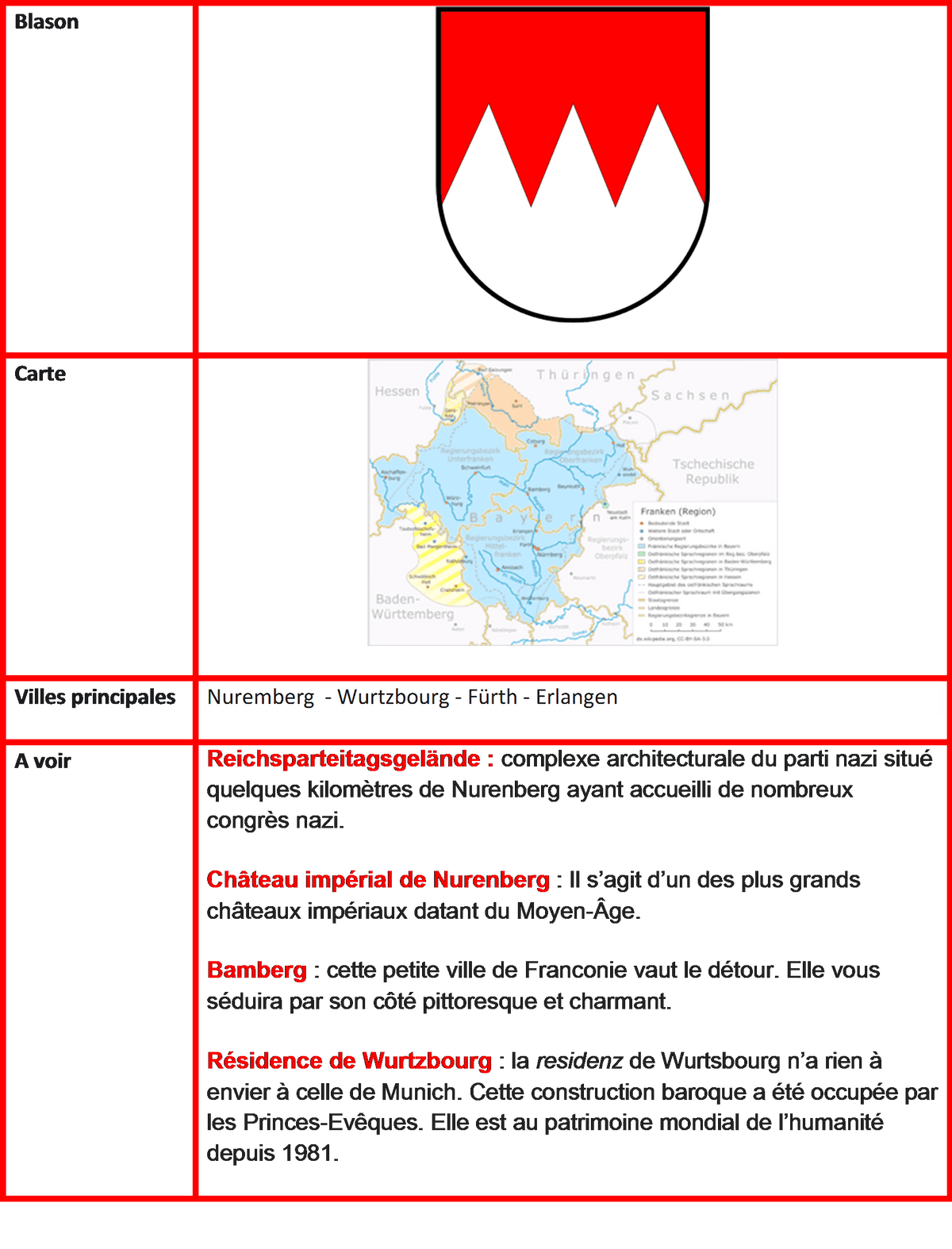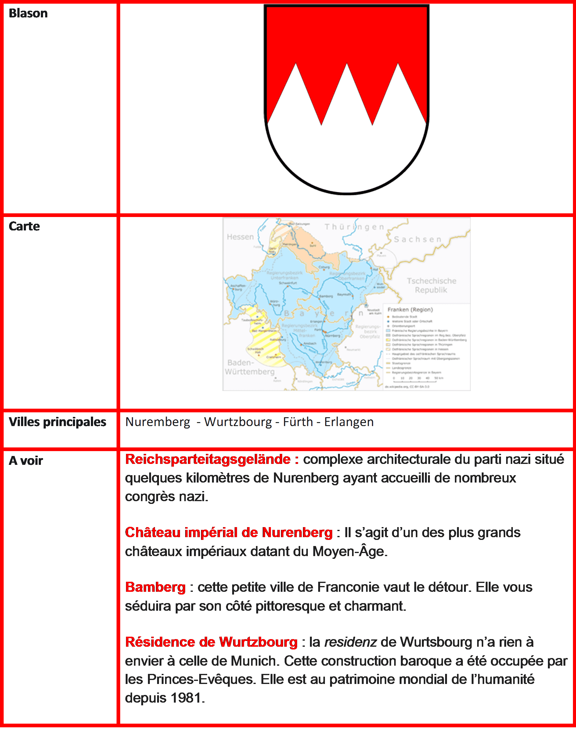 Qui parmi les Français de Munich connaît le nom de "Franconie" ? En allemand, Franken...Non ? Cela ne vous dit rien ? Et pourtant...Nuremberg, que nous connaissons tous, se trouve en plein c?ur de cette région géographique et historique du nord de la Bavière...