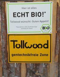 Tollwood est un festival engagé dont deux valeurs sont prônées. La première est l'écologie. À chaque édition, des artistes exposent des ?uvres d'art dont les matériaux proviennent de déchets en tout genre. De cette manière, les organisateurs promeuvent le recyclage et la réutilisation d'objets ayant perdu, à première vue, toute utilité. Cette année, une fleur composée de panneaux de circulation d'autoroute a été placée devant la grande tente accueillant les concerts et les spectacles (voir photo). De même, certaines ?uvres sont faites à partir de bois. La nature est transformée en objet culturel. Le bois est d'ailleurs une matière extrêmement utilisée dans le festival que ce soit pour la construction des stands ou des chapiteaux. Avec un grand nombre de stands alignés les uns après les autres, Tollwood fait donc penser à un petit marché où les artisans proposent leur création aux passants. Celles-ci sont souvent, à l'image de l'endroit, des créations quasi uniques. L'utilisation de matières simples pour les bijoux et les petits ustensiles est encore une fois marquante. Mais on peut tout de même apercevoir un stand dans lequel des pulls en laine épais sont vendus. Malheureusement, les acheteurs se font rares en plein mois de juillet sous un soleil de plomb.