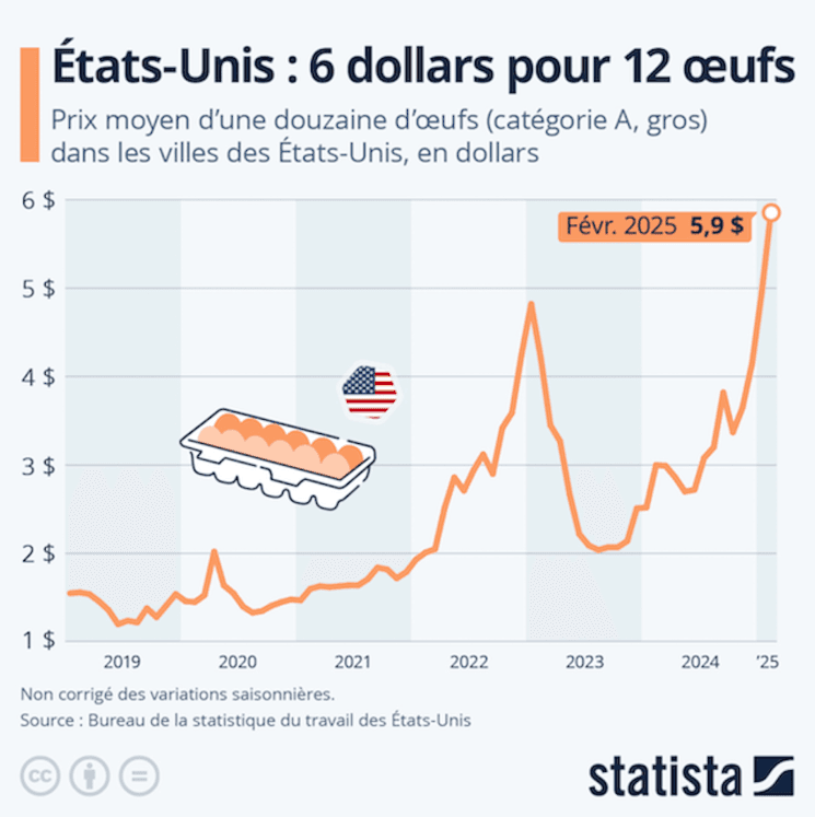 Depuis janvier 2022, la grippe aviaire ravage les poulaillers américains. Conséquence : le prix des œufs s’est envolé. Selon le Bureau des statistiques du travail des États-Unis, la douzaine d'œufs a atteint en février 2025 un prix moyen de près de 6 dollars, soit une augmentation d'environ 97% par rapport à février 2024.