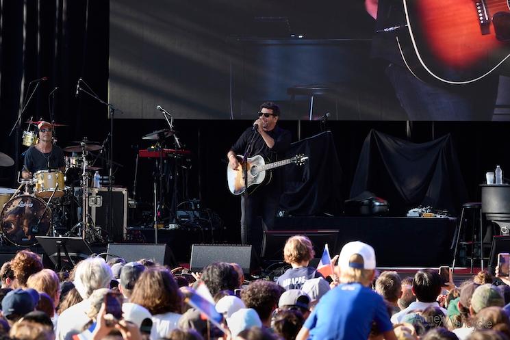 17 heures, la jeune ESTL ouvre le bal, et c’est une réussite. Fierté de Joachim Garraud, le producteur de l’event : « Pour une première scène, c’est une sacrée pression, et elle a relevé le défi avec brio ». La foule a chauffé sa voix, prête à la casser avec Patriiiiiiiick. Instant nostalgie avec « Place des grands hommes », « J’te l’dis quand même » ou « Qui a le droit ». L’artiste est généreux, le public reprend en choeur tous ses tubes. Fan de foot, il aura un mot pour la saison historique du PSG, défait le même jour, à quelques kilomètres de là, en finale de Coupe du monde des clubs, et lancera au pied, un ballon dédicacé dans la foule. Entonné par le Consul Général, à la passion commune et connue, un « Merci Paris » est repris avec ferveur. Avant La Marseillaise, chantée collectivement à pleine voix. Émotion vraie, car communion autour de valeurs. « Le lien d’amitié entre la France et les Etats-Unis est très, très solide » : le message du Consul Général est porté avec conviction, et clair. Roland Lescure, député des français de l’étranger et présent à ses côtés, le fait chaleureusement applaudir pour cette dynamique d’ouverture des actions du Consulat.