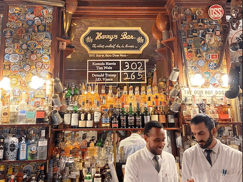 Intrigués, nous demandons à des clients - à l’accent américain - s’ils ont voté : “Je suis de passage à Paris, j’apprécie retrouver l’ambiance new yorkaise le temps d’une soirée ! Je ne connais pas le concept de cette boîte”. Dave, un autre client américain intervient et lui explique le principe, ils rient. Dave est aussi de passage dans la capitale mais a tenu a voter la veille. En 110 ans d’existence du Harry’s Bar, le vote ne se serait trompé que trois fois. Une fois encore, le Harry's Bar a vu juste, Donald Trump devient le 47ème Président des Etats-Unis d'Amérique.