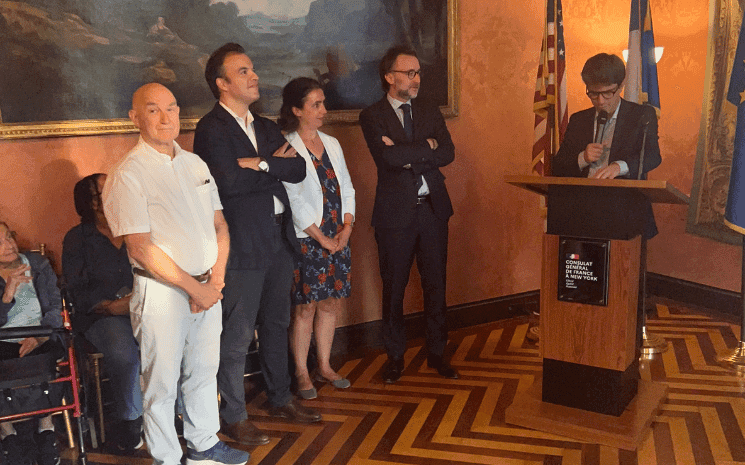 “Redonner sa flèche à la soeur-aînée de Notre-Dame de Paris”, a déclaré Cédrik Fouriscot, Consul Général de France à New York qui accueillait ce jeudi 5 juin, dans les salons du Consulat, le Maire de Saint-Denis, Mathieu Hanotin, en présence de Mohamed Bouabdallah, Conseiller Culturel et Directeur de la Villa Albertine, Domitille Marchal Lemoine, Présidente de Friends of Fondation de France et Gérard Epelbaum, Conseiller des Français de l’Étranger.