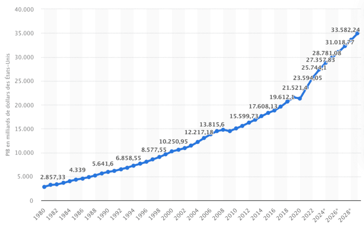 Les États-Unis restent l’une des premières puissances économiques mondiales, d’après les données établies par Statista. Avec un PIB frôlant les 30.000 milliards de dollars, un marché intérieur vaste et diversifié, et des secteurs en constante innovation, la superpuissance américaine offre un terrain de jeu incomparable pour les entrepreneurs étrangers.