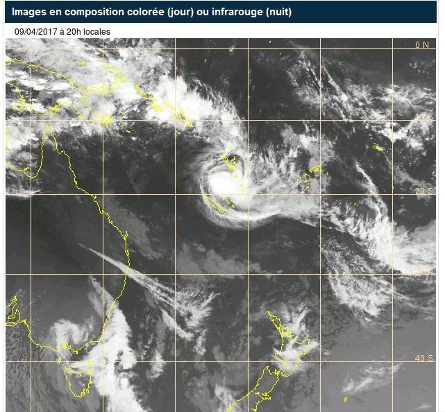 Pour la zone comprenant la Province des Îles, la province Nord ainsi que les communes de Bourail et de Thio : L'alerte cyclonique de niveau 2 est déclenchée le lundi 10 avril 2017 à 12h00 (midi) à l'exception des communes de Belep et de Maré qui demeurent en alerte cyclonique de niveau 1. Pour la zone comprenant la province Sud (sans Bourail ni Thio) : L'alerte cyclonique de niveau 1 est déclenchée le lundi 10 avril à 12h00 (midi). L'alerte cyclonique de niveau 2 est déclenchée le lundi 10 avril 2017 à 20h00.