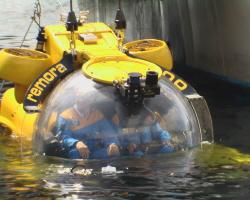 Le REMORA, sous-marin de la COMEX, aurait dû se positionner àplus de 100 m de profondeur au large de la Principauté, mais la météo a eu le dernier mot et tout a étéorganiséau Port Hercule. Le sous-marin jaune, avec S.A.S. Le Prince Albert II àson bord, s'est immergéen premier. S'ensuivit un ballet aquatique au ralenti: plongeurs et bateaux se positionnaient et se repositionnaient, tandis que l'hélicoptère bénéficiait de la vue des goélands. En fin de matinée, le compte àrebours digital (oui, avec les doigts) a signaléque l'heure était venue: Pierre Frolla a plongéaussitôt.