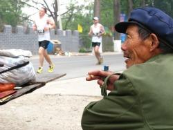 D'ailleurs, parmi les 180 Français de la course, 42 coureurs sont venus depuis la France, pour une semaine de tourisme et de sport, avec le club marathon de France, de l'agence Thomas Cook, pour 2500 euros de budget. Parmi eux, des habitués des marathons, comme Hubert de Bortoli, 1er compatriote cette année en 3h55'02, ou le couple Massard, venu fêter leurs 40 ans de mariage. Eux aussi apprécient particulièrement le site. "Quand tu n'es pas bien, il suffit de regarder autour de toi. On n'est pas n'importe où quand même, ça remotive". Le parcours permet aussi de passer par de petits villages qui apportent son charme à la course. Si les villageois ne comprennent pas trop ce qui se passe, ils apprécient le spectacle, assis sur le pas de leur porte, à l'image d'un Tour de France. Et les enfants encouragent les marathoniens, courant sur 200m avec eux, ou tapant dans leurs mains. Grâce à la géniale organisation de Marc, les sportifs dorment dans un de ces villages, juste à côté de la ligne de départ. "C'est pour ça aussi que je reviens", explique aussi Thomas Fer. Il est en effet très appréciable de ne pas avoir à faire les 2h de route depuis Pékin le matin de la course. Car le lever est déjà matinal, à 6h du matin.