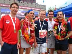 Cette année, une marque française s'est particulièrement distinguée. Le team Salomon a vu ses trois coureurs terminer main dans la main, en battant facilement le record du marathon de 9mn, en 3h09'22s. Idem côté femme avec un record abaissé à 3h32'12s. Il faut dire que le temps était idéal pour la performance, nuageux autour de 18°C. Surtout, le team est spécialiste du trail running, au degré d'exigence encore supérieur, et parmi les vainqueurs figure d'ailleurs Jonathan Wyatt, Néozélandais sextuple champion du monde de course en montagne. Comme le reconnaissait Gregory Vollet, manager français de la team, c'est un super coup de communication pour la boîte qui travaille sur l'ouverture de circuits en Chine.