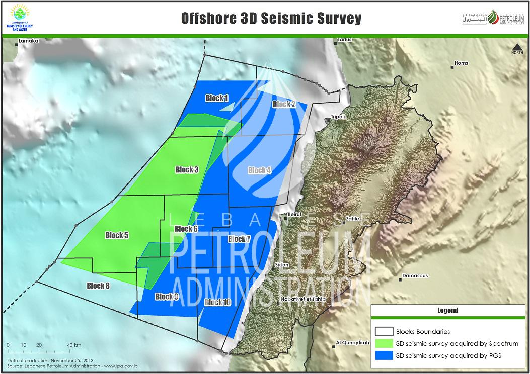 Suite à la loi autorisant le forage et l'exploitation des hydrocarbures aux larges des côtes, votée par le Parlement en août 2010, la Lebanese Petroleum Administration (LPA), placée sous la tutelle du ministère de l'Energie, a été crée. Cette instance a divisé la zone exploitable en dix blocs dont les numéros 1, 4, 8, 9 et 10 devront être explorés en priorité.