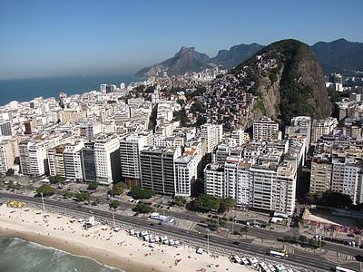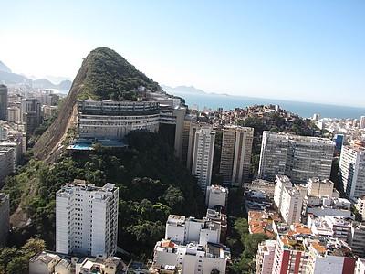 Nous mettons en parallèle deux photos du même Morro : le Morro do Cantagalo (colline de Cantagalo), situé entre Copacabana et Ipanema. Ces deux photos présentent litérallement une colline à deux visages. La première photo est prise depuis le nord, au dessus de la plage de Copacabana en direction du sud. On y voit, au premier plan, le quartier de Copacabana. Au second plan sur la droite, le Morro do Cantagalo et sur la gauche, le quartier d'Ipanema. À l'arrière plan, on aperçoit le Morro dos dois Irmãos (la colline des deux frères, colline à deux têtes), et la chaîne de montagnes de Tijuca. Vu d'ici le Morro est recouvert de favelas. On y trouve les favelas Pavão-Pavãozinho et Cantagalo. Ces deux favelas sont celles qui ont reçu un nouvel ascenceur public d'accès en juin.