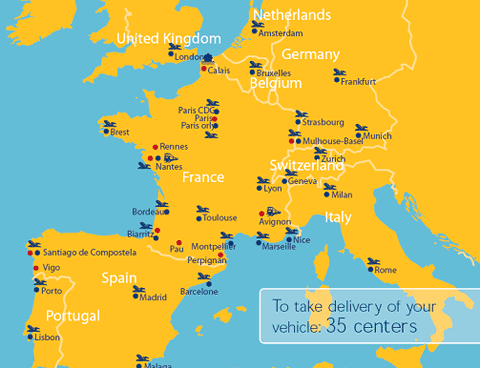 Renault Eurodrive, c'est aussi la possibilité de se faire livrer et de restituer son véhicule partout en Europe : Allemagne, Angleterre, Belgique, Espagne, France, Italie, Pays-Bas, Portugal et Suisse. 34 centres de livraison et de restitution sont à votre disposition, vous avez même la possibilité de rendre le véhicule dans un centre différent de celui de la livraison !