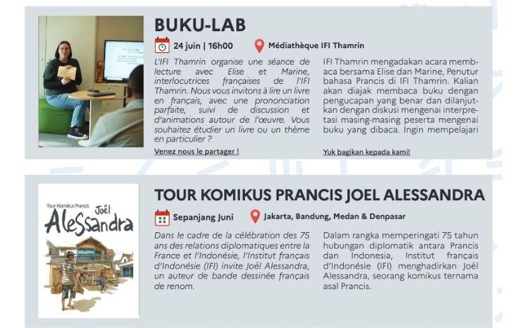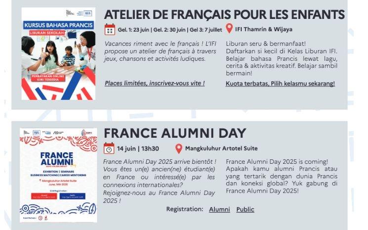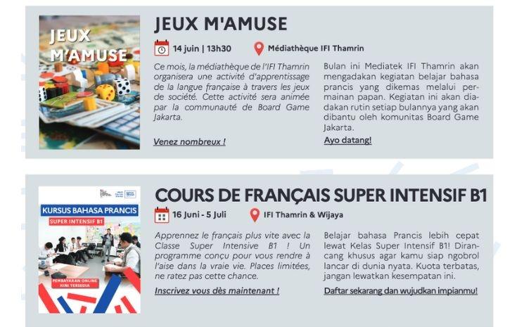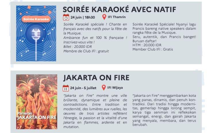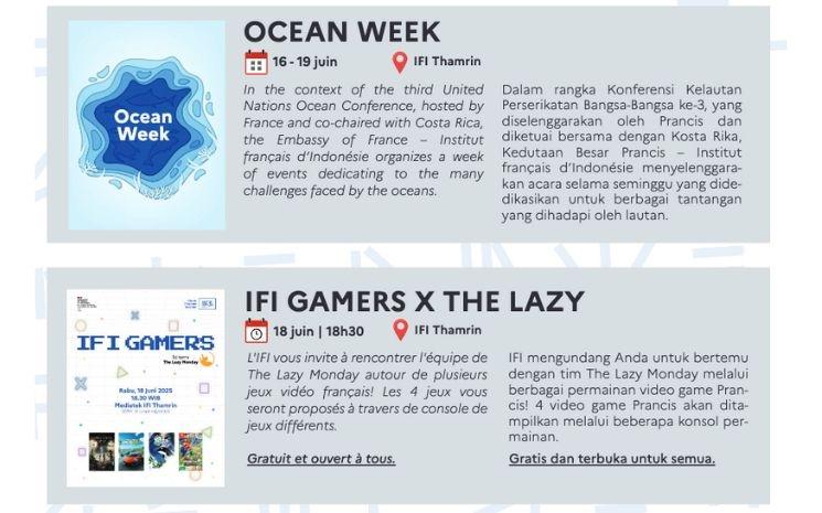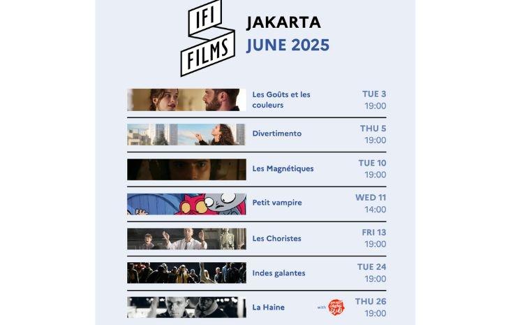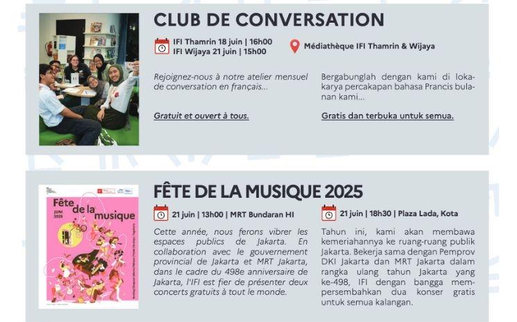 Le programme de l’IFI Jakarta pour le mois de juin 2025 est disponible ! L'Institut Français vous invite à participer à diverses activités à l’IFI Thamrin et à l’IFI Wijaya, telles que des cours de français, Alumni Day, Ocean Week, ateliers, jeux, expositions et karaoké ! Pour plus d'infos rdv sur le site de l'IFI.