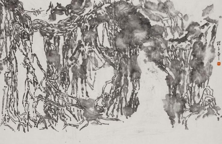 Enfin, la troisième partie de l’exposition, “On my own grounds”, marque un virage dans la carrière de Lim à travers son aspiration à tendre vers de nouvelles techniques. L’illustration figurative prend ainsi la forme de motifs empreints de calligraphie qui constitue ce qui est devenu son invention propre, le “hutuzi”. Lim crée ici ses propres règles quand il s’agit d’exprimer sa sensibilité esthétique. Il explore la représentation à l’encre comme méthode d’écriture poétique et de création visuelle. Dans une de ses œuvres les plus récentes, “Regardless Of Right Or Wrong, Success Or Failure, It All Turns Into Emptiness ; Only The Lush Mountains Remain, And The Red Sunset Persists” (2023), Lim atteint un degré de pureté dans son habilité à allier peinture et calligraphie grâce à un jeu de pièces de puzzle enchevêtrées associant la verticalité de l’écriture chinoise à l’absence de personnages identifiables malgré la présence de teintes évocatrices. Un carnet de l’artiste exposé en vitrine signe un véritable dictionnaire visuel servant de base à ses créations abstraites. Un enregistrement vidéo retrace quant à lui le travail calligraphique de l’artiste en 12 minutes où l’on peut voir Lim reproduire à l’encre de chine un poème de la dynastie Tang. Voguant entre espaces et vides, le pinceau alterne encore une fois entre des lignes brisées et des textures plus veloutées dans une conception consciente d’art abstrait. Le rythme y est différent même si on peut y retrouver le même souffle dans l’appréhension des volumes et la place réservée à la nature (“Forest path”, 1985). Cette partie comporte aussi son œuvre la plus grande en taille, mesurant près de 5 mètres de long, dont l’intensité des lignes verticales entrecoupées incarne la fluidité d’un monde moderne en transition.