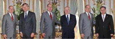 Pour ces trois cérémonies qui se sont déroulées au Palais princier, S.A.S. Albert II était entouré de Georges Lisimachio, son chef de Cabinet, Jacques Boisson, secrétaire d'État et Mireille Petttiti, directeur général du Département des Relations extérieures.