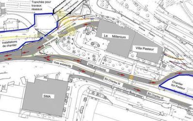 Les travaux de dévoiement définitif des réseaux publics (eau, électricité…) sous le boulevard Rainier III, qui sont nécessaires à la construction de la sortie du tunnel descendant, seront réalisés du 5 novembre au 21 décembre 2012 (voir l'illustration).