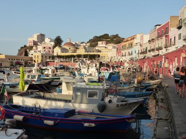 Il est à peine 10 h quand le ferry nous dépose à Ponza. Le village dort encore, seuls quelques « lève-tôt » prennent leur premier café en terrasse. Le dépaysement est immédiat. Les bateaux de pêche se reflètent dans l'eau turquoise. Le village grimpe à flanc de colline, curieux enchevêtrement de maisons carrés aux façades colorées, accolées les unes aux autres comme des briques de Légo.