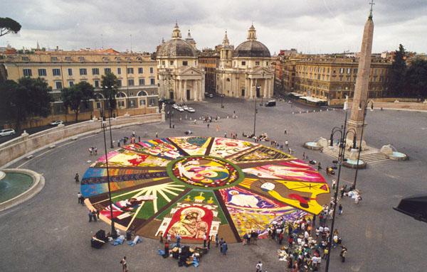 Si vous avez bien suivi nos explications historiques et qu'elles vous ont plu, vous pouvez donc la jouer classique. Vous aimez la tradition, l'histoire, le baroque, la démesure ? Les feux d'artifice vous font vibrer et la délicatesse et le kitch des dessins de fleur vous font frissonner de plaisir ? Dès aujourd'hui et demain aussi, vous pourrez venir admirer la VIème édition de l'« infiorata storica ». Il s'agit de tapis de fleurs qui s'étendent à ciel ouvert sur la Via della Conciliazone, une des plus célèbres artères romaines qui relie le Château Saint-Ange à la place Pie XII (Piazza Pio XII), qui elle-même s'ouvre sur la place Saint-Pierre. Les sbandieratori ?Draghi di Castel d'Ariano? que l'on pourrait traduire par jongleurs de drapeaux, habillés avec des costumes dessinés par Michelangelo doivent se produire en spectacle sur la place.