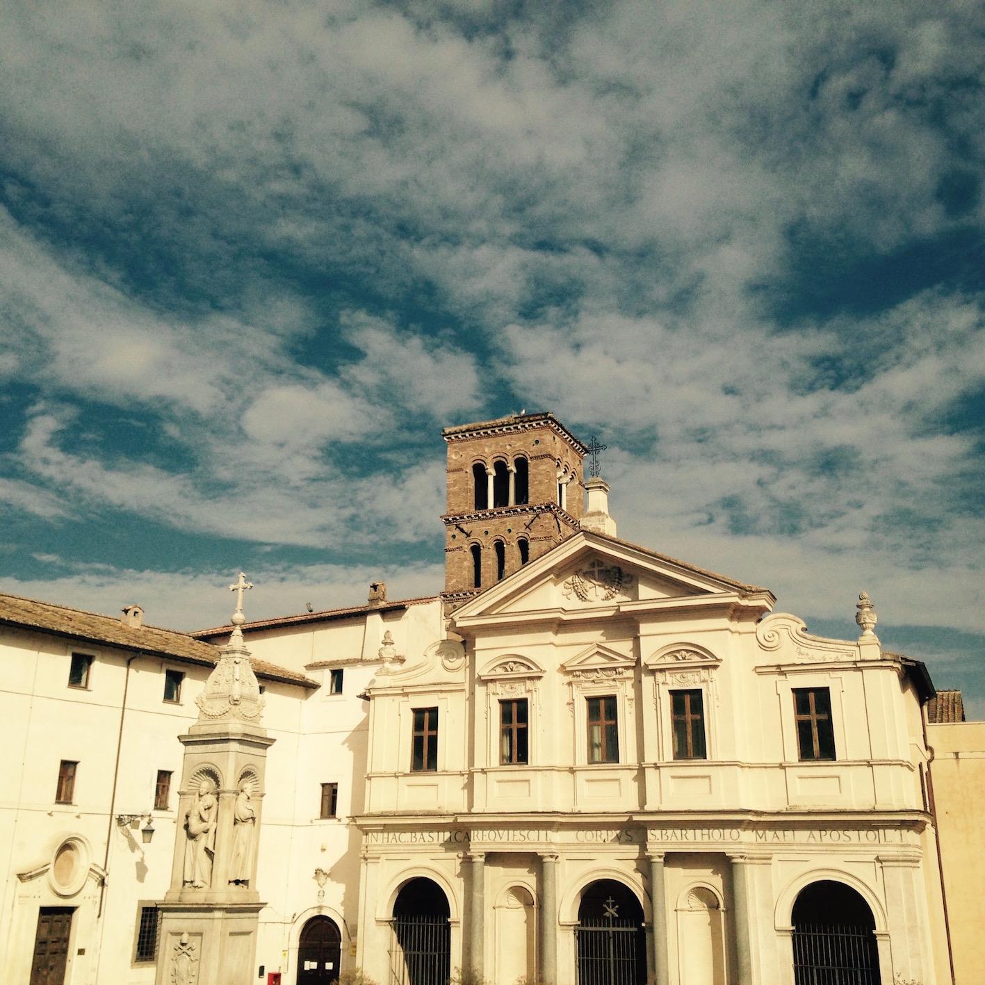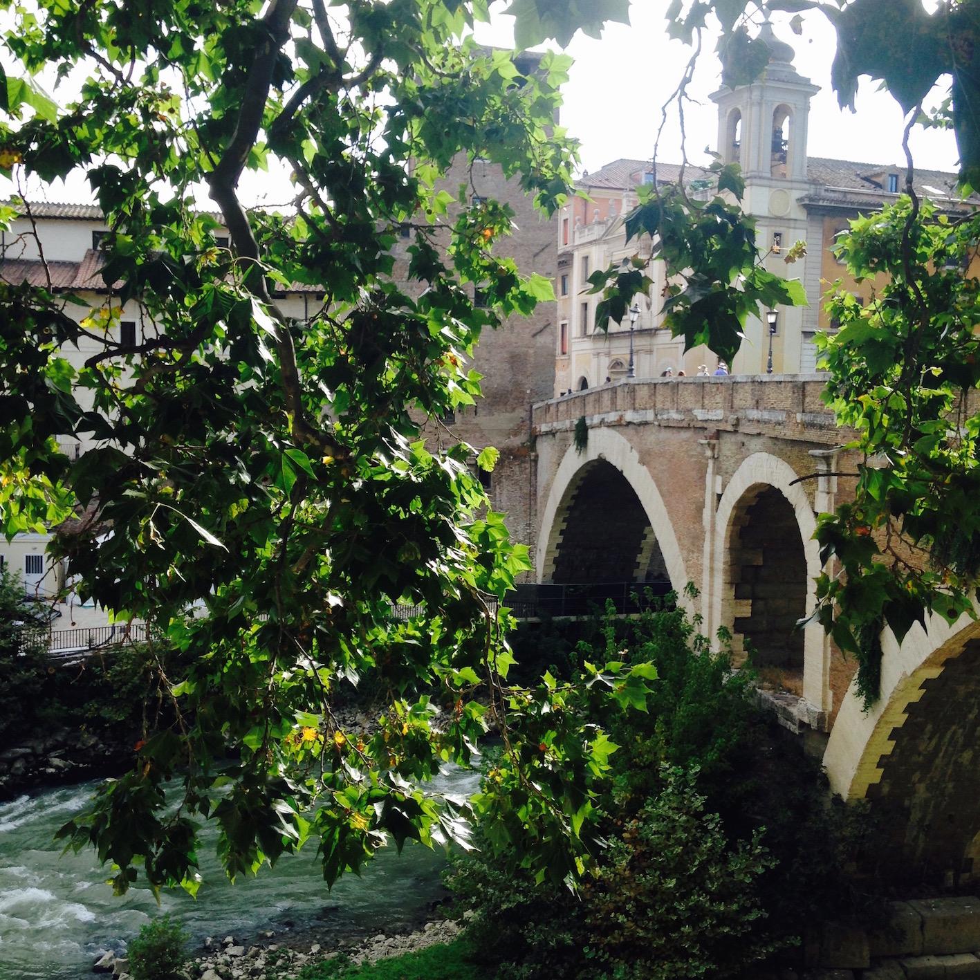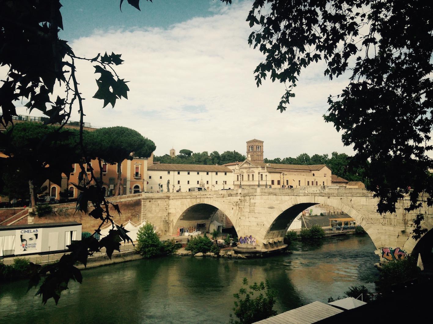 L'Isola Tiberina est la seule île urbanisée du Tibre au centre de Rome. Elle est reliée au quartier de Trastevere par le Ponte Cestio et au quartier juif par le Ponte Fabricio. Durant l'Antiquité, l'île abritait le temple d'Esculape, une divinité guérisseuse. Aujourd'hui, Esculape a cédé la main aux médecins des hôpitaux Fatebenefratelli et israélite qui occupent la plus grande partie de l'île. En traversant le ponte Cestio on arrive devant la Basilique Saint-Barthélemy-en-île construite à la fin du Xème siècle qui fait face à une pharmacie à la vitrine surannée. Il flotte définitivement sur l'île un parfum médicinal !