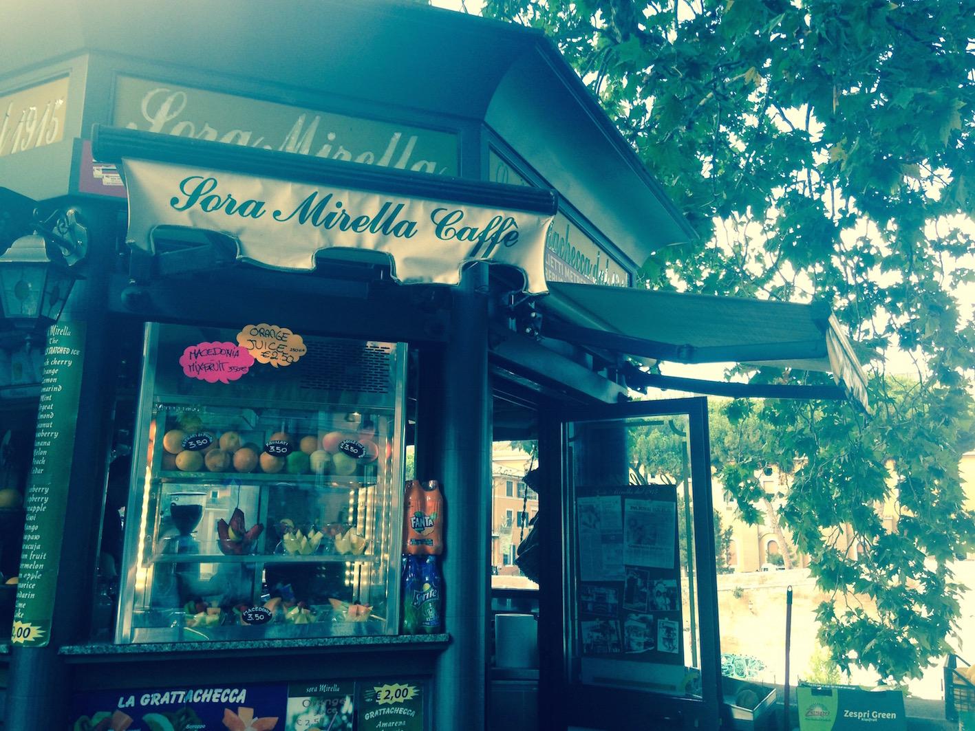 Ce petit kiosque vert affiche fièrement son année de naissance : 1915. Mais c'est surtout Mirella Mancini qui l'a rendu populaire dans les années 1970'-1980' et lui a donné son nom actuel : « Sora Mirella », sora voulant dire signora dans le dialecte romain. Le journaliste américain Louis Inturrisi a écrit un article sur les grattachecche dans le New York Times en 1986 et a consacré quelques lignes à Mirella Mancini, un sacré bout de femme à la verve facile et chantante comme toute Trasteverine qui se respecte. Elle était d'ailleurs amie avec une autre Trasteverine célèbre, sora Lella, qui a joué dans de nombreux films d'Ettore Scola et de Carlo Verdone. Mirella Mancini s'est éteinte en 2013 et ses fils, Alessandro et Stefano, ont repris son commerce. La grattachecca est encore leur produit phare mais ils proposent également des tramezzinis, des macédoines de fruits et des cafés tout à fait corrects. Suivez notre conseil : commandez une grattachecca al cedro (un cousin plus sucré du citron) et installez-vous sur le mur adjacent au kiosque en face de l'isola Tiberina. Enfin, profitez du coucher de soleil incandescent pour clore cette deuxième étape de notre marathon culinaire.