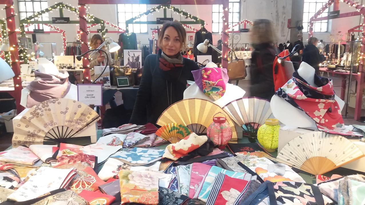 On craque aussi pour les tissus japonais de Federica Angelici, sur le stand Shinko. Un aimant astucieux permet aux tours de cou de tenir comme par magie, et les étoffes sont vraiment magnifiques.
