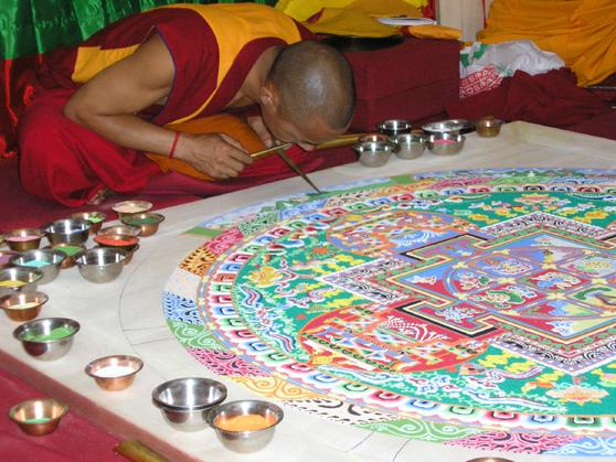 Le mandala signifit en sanskrit "cercle". C'est une figure composée de cercles cocentriques. Le dessin représente la vue d'en haut du palais céleste dans lequel demeure l'être illuminé. La méditation sur la mandala est une méthode pour se libérer des souffrances de l'existence cyclique (le samsara). Le mandala peut être peint sur une étoffe, fait avec du sable coloré. Quand il est fait de sable, il est généralement dispersé dans le fleuve.