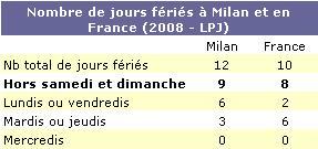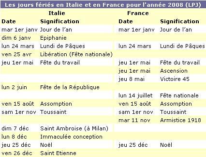 Pour bien commencer 2008, rien de tel qu'un petit coup de d'?il au calendrier pour planifier dès maintenant les prochains ponts ou même les prochaines vacances. Cette année, Pâques sera fêté plus tôt que les années précédentes, le 24 mars, une bonne nouvelle pour les skieurs. Le 25 avril, jour de commémoration de la libération de Milan de l'occupation allemande, est un vendredi. Le 1er mai tombe un jeudi, ce qui laisse la possibilité de faire un grand pont. Lundi 2 juin, on célèbrera la fête nationale, les Italiens ayant voté par référendum la République le 2 juin 1946, provoquant l'exil du roi d'Italie Humbert II de Savoie au Portugal. La Toussaint tombe un samedi et la saint Ambroise un dimanche. On chômera tout de même le lundi 8 décembre, jour de l'immaculée conception. On fêtera Noël un jeudi et saint Etienne le vendredi qui suit.