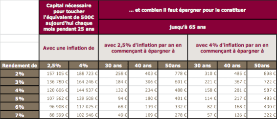 A titre d’exemple, voici ce qu’il faut cotiser en fonction de son âge, pour avoir un revenu complémentaire de 500€/mois