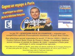 Depuis 1993, l'émission "Questions pour un Champion"organise une compétition francophone. L'Italie est un des dix pays choisis pour participer à l'edition 2009. Les candidats seront sélectionnés à Rome par le Groupe Fremantlemedia, producteur de l'émission. Vous avez encore quelques jours pour tenter votre chance