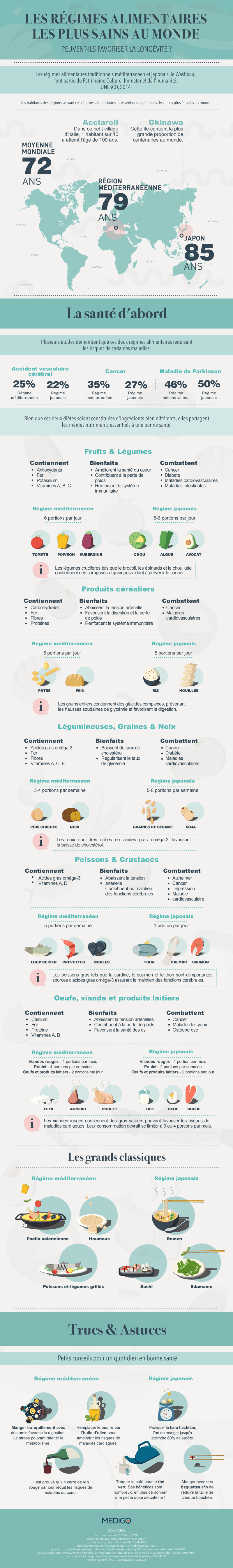 Cette infographie explore les deux régimes alimentaires considérés comme les plus sains au monde, et donne des exemples pour une bonne alimentation.