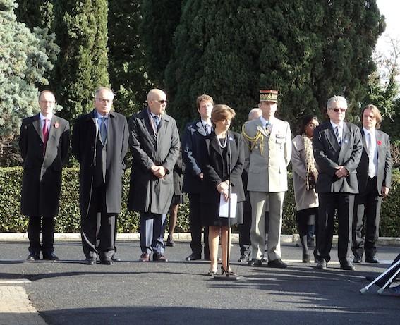 Puis, ce fût au tour de Catherine Colonna de prendre la parole, elle s'est tout d'abord exprimée à travers les mots du Colonel Driant, qui adressa une dernière lettre à sa famille avant de partir au front, le 21 février 1916 : « Je ne t'écris que quelques lignes hâtives, car je monte là-haut, encourager tout le monde... ». 18,5 millions est le funeste bilan de cette 1ère guerre mondiale, incluant les troupes françaises mais aussi britanniques. En s'exprimant un court moment en anglais, Catherine Colonna a rendu hommage au sacrifice des troupes anglaises, invitant l'assemblée à se remémorer la bataille de la Somme. Symbole de cette alliance franco-britannique, elle fût l'une des plus sanglante bataille de ce conflit.