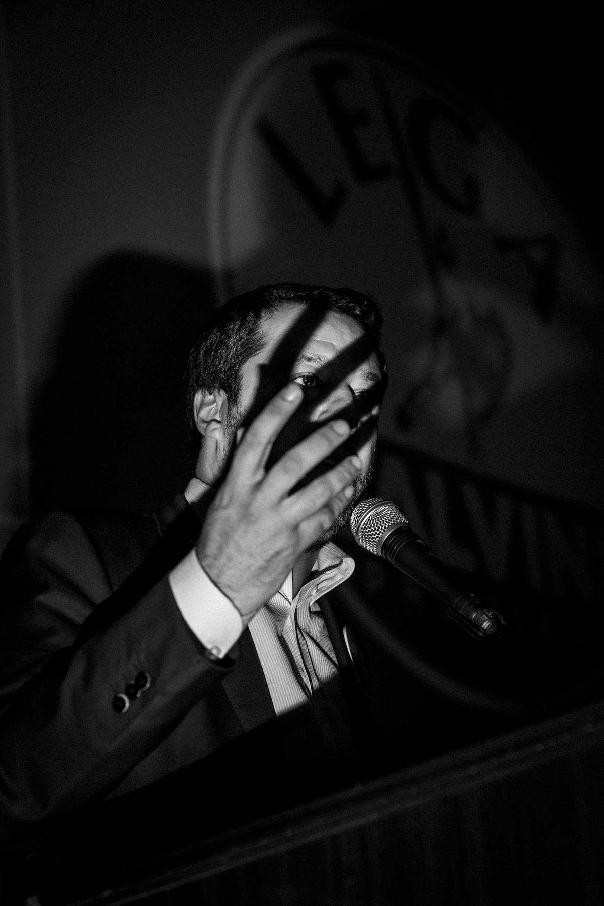 L’artiste photographe, après une courte introduction d’Alessandro Cartosio, prend la parole. Il s’adresse en italien à la dizaine de personnes que la salle comble a la possibilité d’accueillir, accompagné d’un vidéo projecteur qui illustre ce qu’il expose. Un récit direct, sympathique et personnel qui a la volonté de nous expliquer non pas comment sa passion lui est venue, mais comment il a étudié, sous certaines contraintes, la photographie. C’est ainsi qu’il nous entraîne dans ses pérégrinations new-yorkaises, où il a appris les rudiments de la photographie en s’initiant aux structures narratives que considère le photo-journalisme.