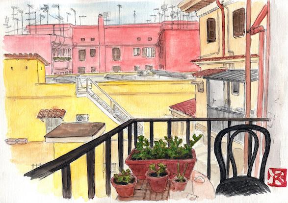 Quarantaine, les fenêtres nous offrent tous les jours le même spectacle, les mêmes façades des condominii voisins, cette vue toute particulière dans le quartier de San Lorenzo. Sur le balcon, on a planté les boutures de nos vieux légumes. Les plantes poussent et marquent le temps qui passe, suspendu à ce petit balcon, notre mètre carré de liberté.