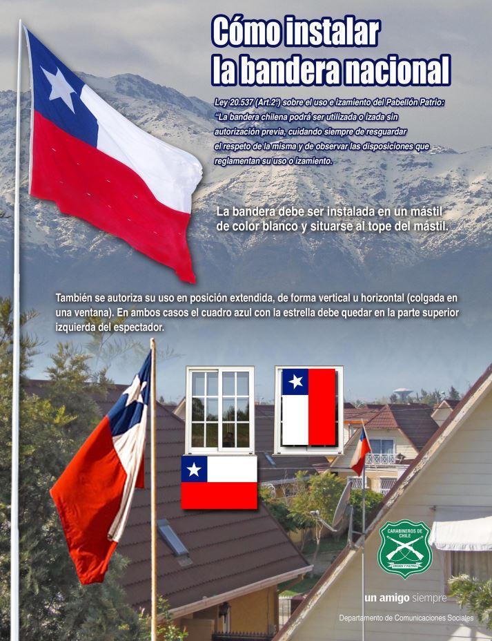 Chaque demeure chilienne doit être honorée d'un drapeau du pays pour les fêtes nationales. Ce symbole patriotique est obligatoire pour tous les citoyens de la République du Chili les 21 mai (anniversaire de la bataille navale d'Iquique, guerre du Pacifique ? 1879) et pour les 18 et 19 septembre (première assemblée autonome de gouvernement à Santiago ? 1810).?
