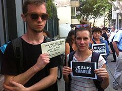 C'est avec émotion que l'ambassadeur français, Marc Giacomini, salue cette « initiative citoyenne » et remercie son auditoire d'avoir fait acte de présence. Reprenant les mots de François Hollande, il souligne l'importance d'un tel rassemblement et dénonce ?l'atteinte directe et évidente à l'un des fondements de la démocratie qu'est la liberté d'expression?. S'en suit une minute de silence lourde de sens, et sur tous les visages se lisent la tristesse et la consternation. Le rassemblement, comme tous les autres en France et ailleurs, fait prendre conscience qu'il s'agit d'un événement historique pour le pays, un ?11 septembre français? comme le titrait Le Monde dans son édition du 9 janvier.